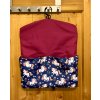 Závěsný kapsář, ušitý z kočárkoviny, díky které je nepromokavý, oděruvzdorná a má pět kapec (4 vkládací a jedna velká na zip).