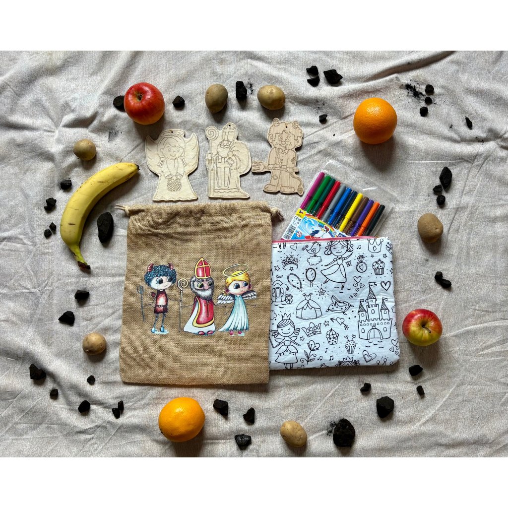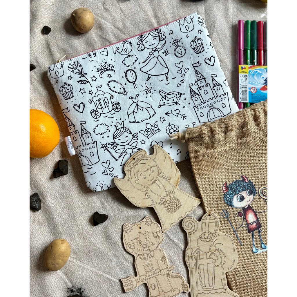 Jutový pytlík s potiskem, dřevěné postavičky k vybarvení, omalovánkové pouzdro (princezny) a sada fixů jako dárek!